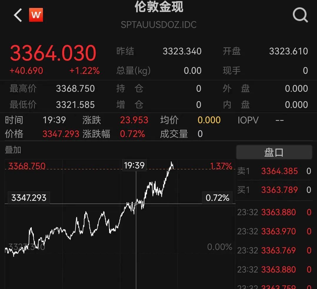贵金属行情爆发,黄金、白银明显上涨,截至23:30发稿,现货黄金涨超1%,站上3364美元/盎司,被誉为“黄金平替”的白银和铂金涨幅更大,目前均涨逾3%。