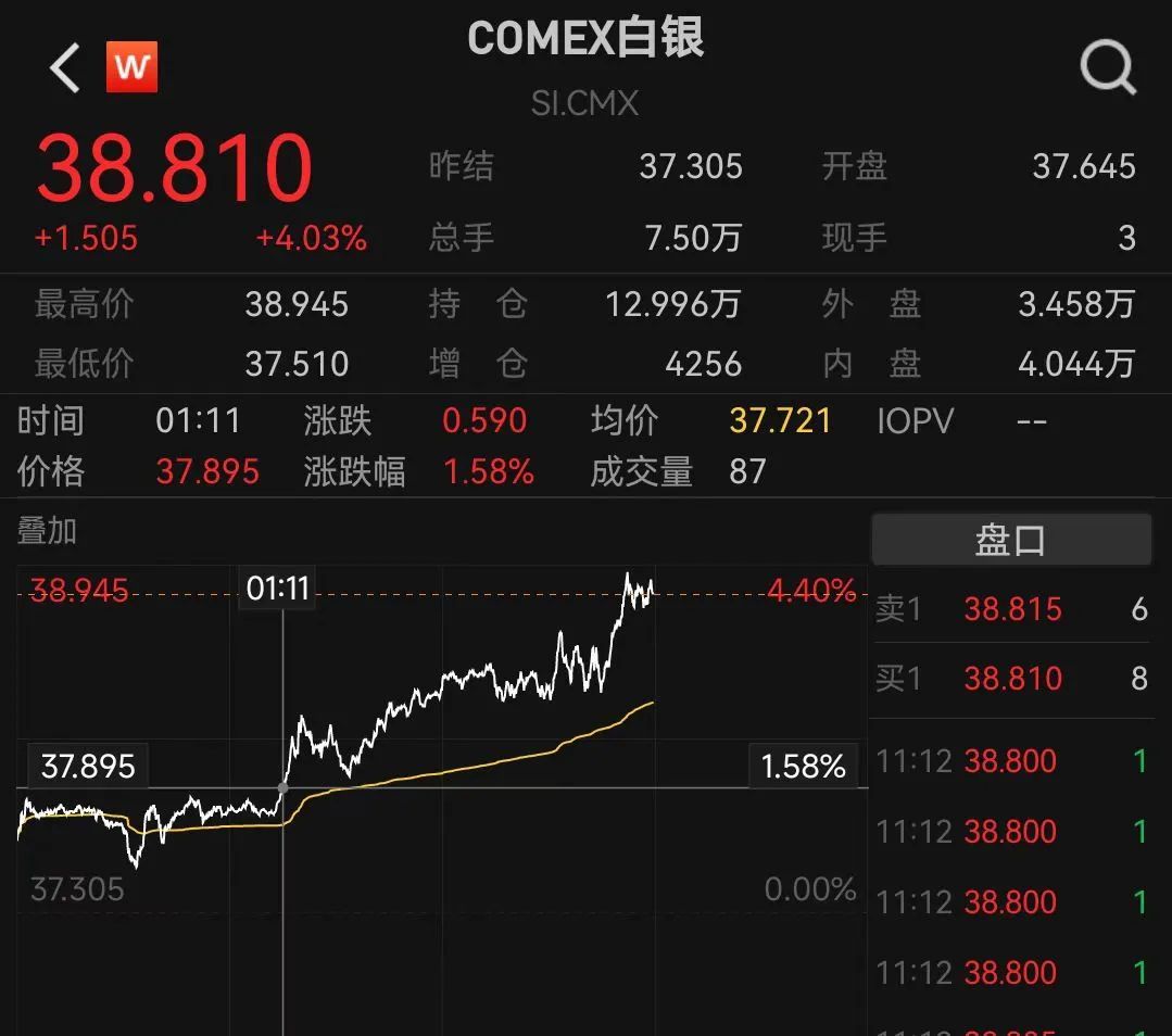 现货白银日内上涨超4%,站上38美元/盎司,创2011年9月以来新高。
